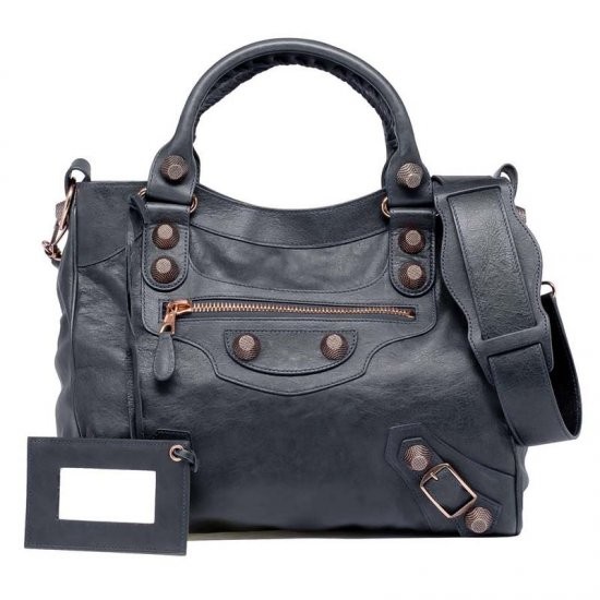 Description: Palladium plated metal hardware - top zip closure - hand stitched handles - removable shoulder strap - front zip pocket - leather framed hand mirror - interior zip pocket with Balenciaga embossed leather tag - made in Italy.
