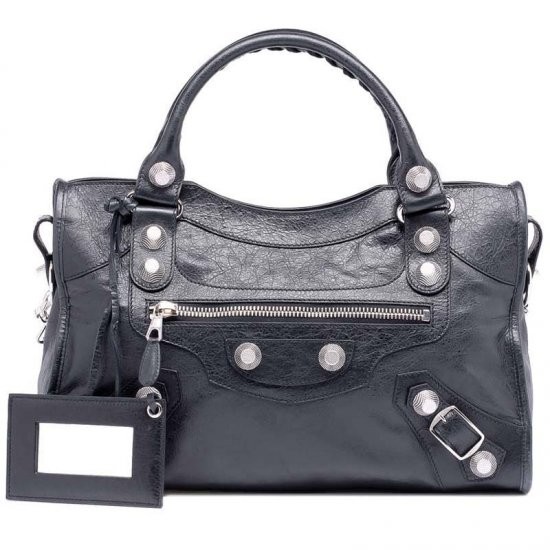 Description: Palladium plated metal hardware - top zip closure - hand stitched handles - removable shoulder strap - front zip pocket - leather framed hand mirror - interior zip pocket with Balenciaga embossed leather tag - made in Italy.