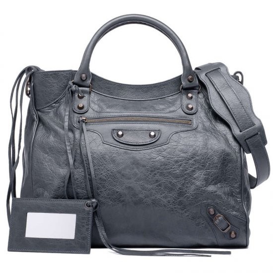 Description: Aged brass hardware - top zip closure - hand stitched handles - removable shoulder strap - front zip pocket - leather strings on zips - leather framed hand mirror - interior zip pocket with Balenciaga embossed leather tag - made in Italy