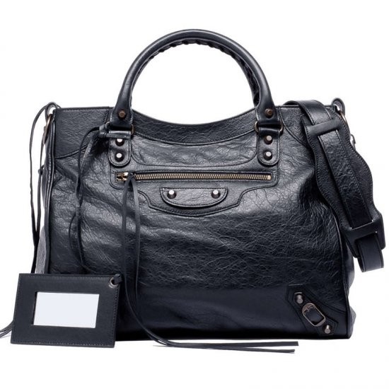 Description: Aged brass hardware - top zip closure - hand stitched handle - front zip pocket - leather strings on zips - leather framed hand mirror - interior zip pocket with Balenciaga embossed leather tag - made in Italy.