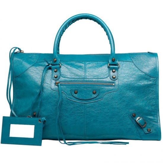 Description: Soft vintage crafted lambskin - aged brass hardware; top zip closure - hand stitched handles 13 cm drop - front zip pocket; leather strings on zips - leather framed hand mirror - fine textile lining - interior zip pocket with Balenciaga engraved plaque - made in Italy.