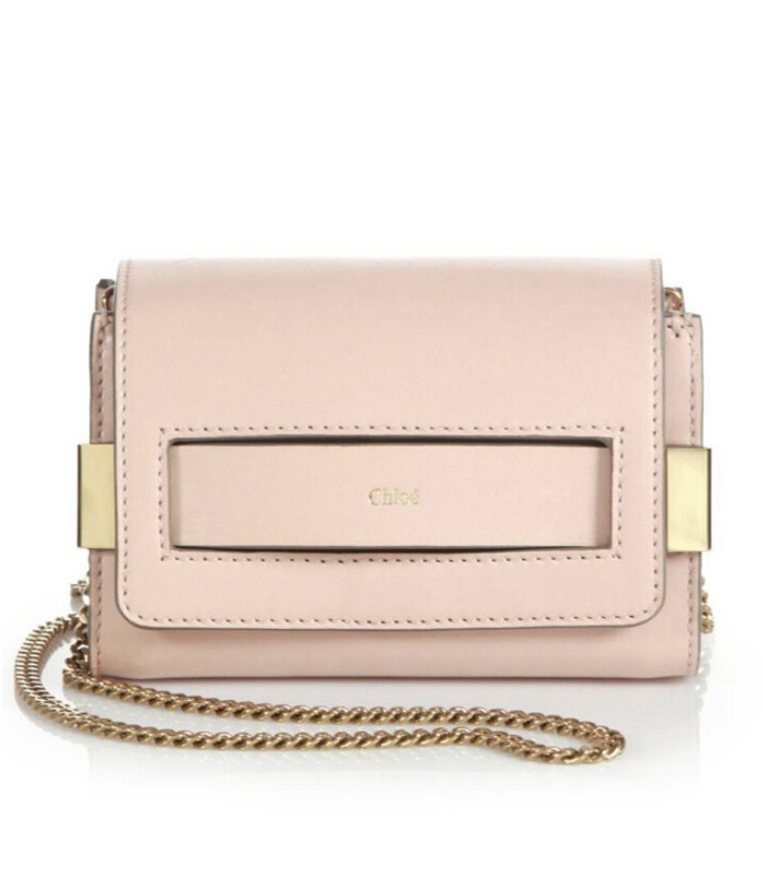 A rectangular cutout at flap reveals a curved band stamped with the Chlo logo, its edges trimmed in goldtone hardware and finished with a chain strap for versatile wear.