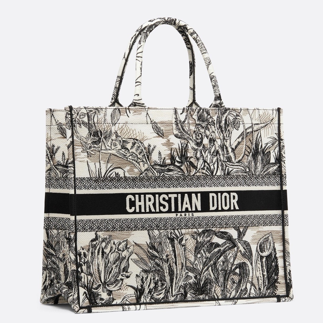 - 100% canvas embroidered with a black and white Toile de Jouy Carnivora motif- Carried in the hand or on the shoulderSize: 41.5 x 35 x 18 cmComes with Dior dust bag and certificate card.