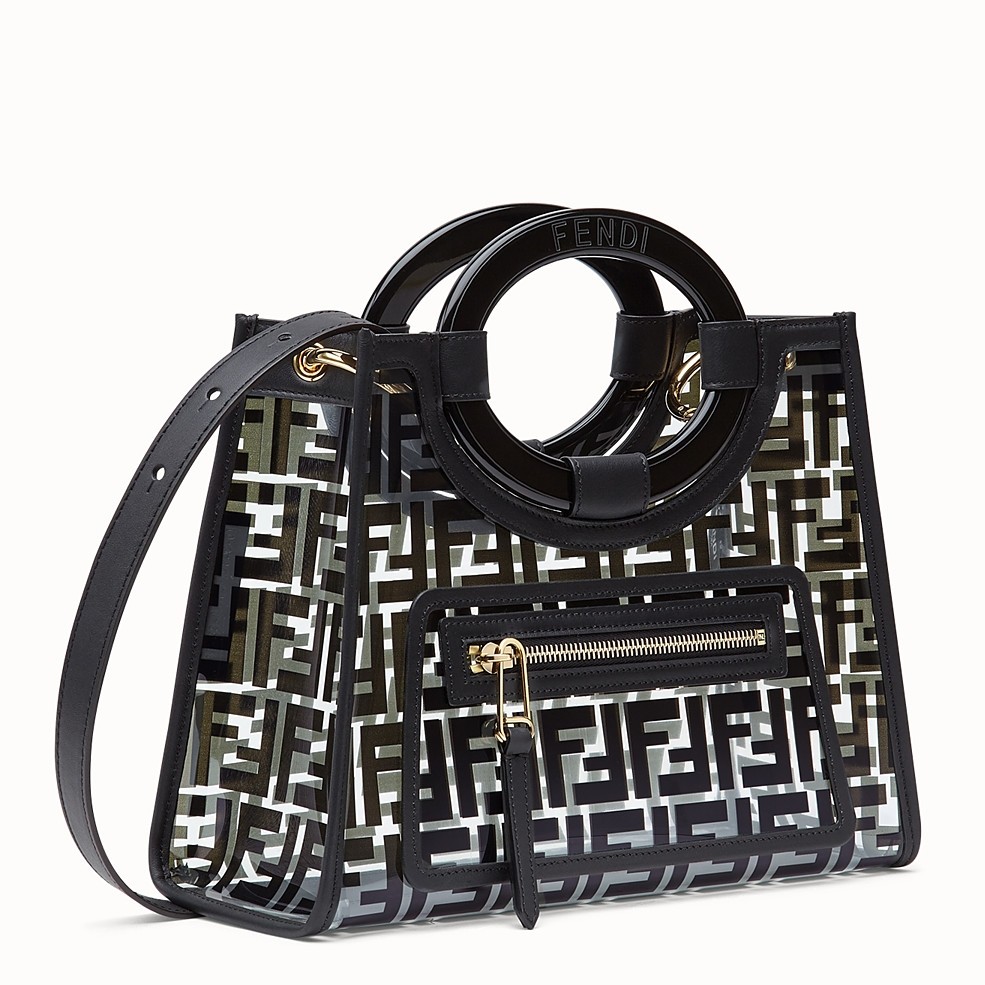 - 100% PVC with FF motif printed- Calfskin leather trimming- Rigid oval double handle- Open top- One exterior zip pocket- Gold-finish metalware.Size: 44 x 38 x 20 cmComes with Fendi dust bag and certificate card.