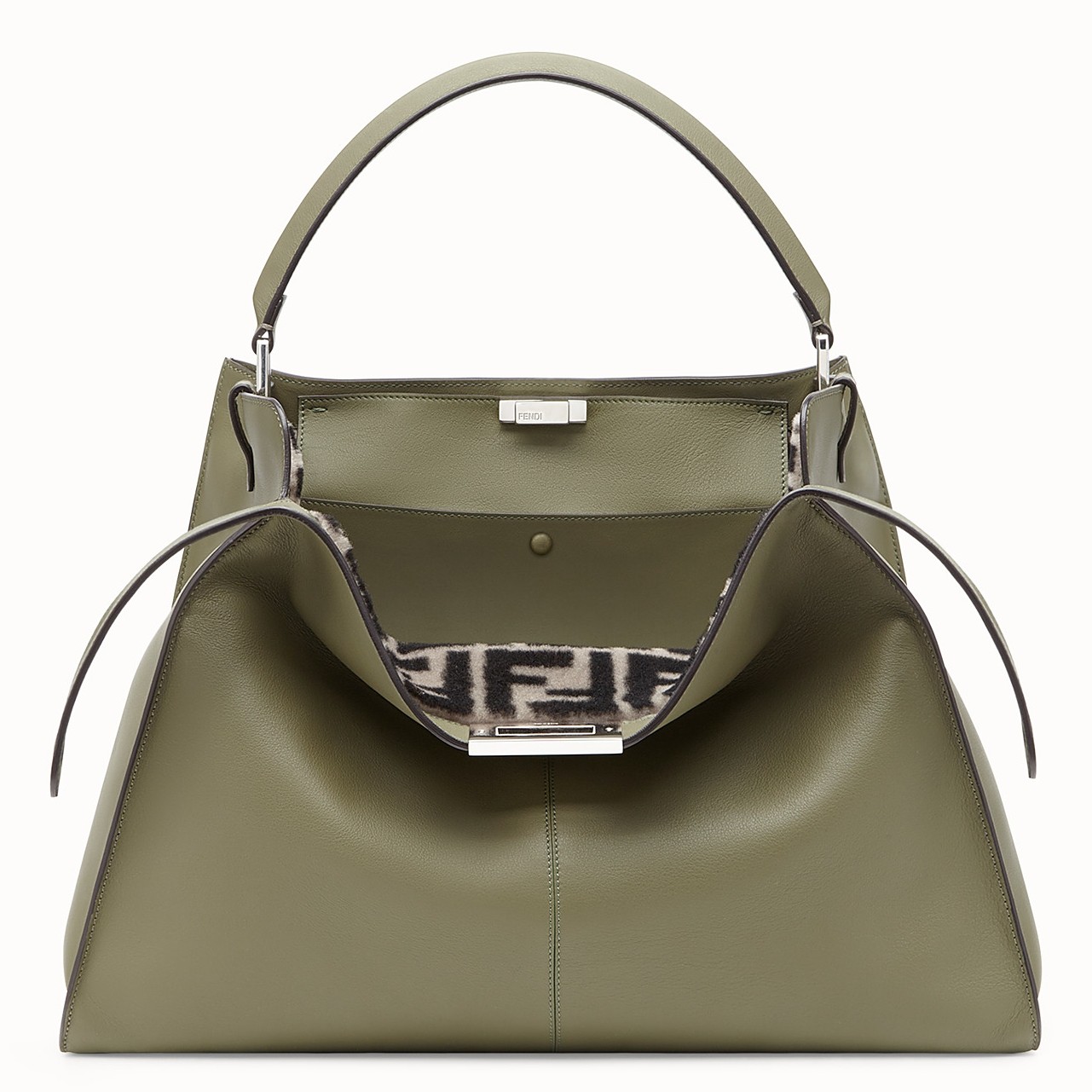 - 100% calfskin leather- Single top handle- Twist lock closure- Lined in grey sheepskin printed with contrasting FF motif- Interior one pocket- Protective feet at baseSize: 43 x 32 x 14 cmComes with Fendi dust bag and certificate card.