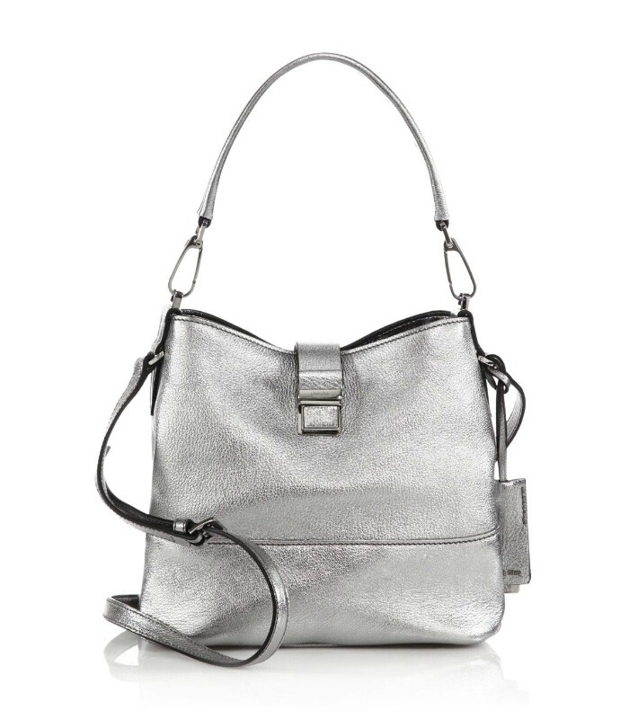 A slouchy yet polished design in rich pebbled metallic leather accented by a tab-style push lock and sleek hardware.