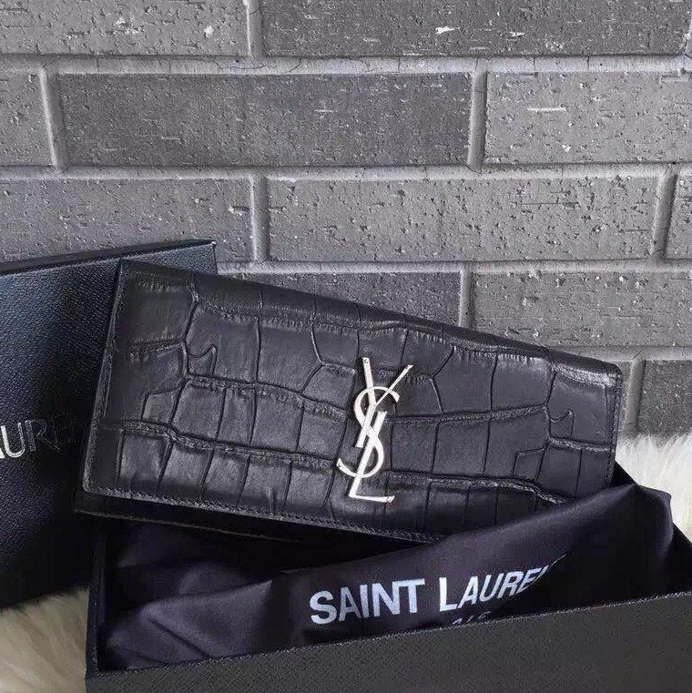 - Crocodile embossed leather- Silver-tone YSL logo to front- Flap with magnetic closure- Interior slot pocket- Suede leather liningSize: 27 x 13 x 5 cmComes with Saint Laurent dust bag,anthenticity card and box.